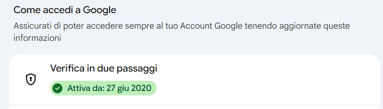 Utilizzeremo Google come esempio, ma la procedura è la stessa e identica per qualsiasi servizio o social. Per prima cosa andiamo nelle impostazioni di sicurezza dell’account (nel caso di Google le troverete qui) scendiamo su “Accesso a Google” e clicchiamo su “Verifica in due passaggi”, come mostrato nell’immagine seguente: